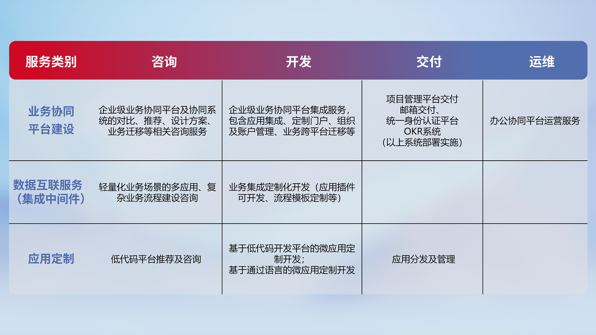 针对钉钉、、、企微、、IDaas等平台级产品提供产品的规划、、方案、、、交付、、、、定制化开发等服务,,,实现如统一协同办公、、、、智能客户服务、、、、混合会议管理、、智能数据查询、、等业务场景,,,实现数字化转型。。。